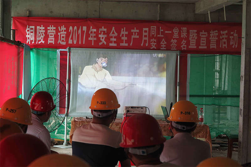 活动伊始,总经理章为民作动员讲话,阐述了公司安全生产工作的重要意义,并就安全工作提出要求与建议。随后,公司领导与项目部人员一同观看了“同上一堂课”--《建筑施工人员安全生产教育》宣传片、《火场逃生与自救》消防专题宣传片,生动形象的使各级管理人员受到了一次深刻的安全教育,提高了安全生产意识。活动中,组织了项目部人员进行“反三违、遵纪守法”宣誓,并郑重签名承诺;组织人员进行消防演练,示范灭火器的正确使用方法。